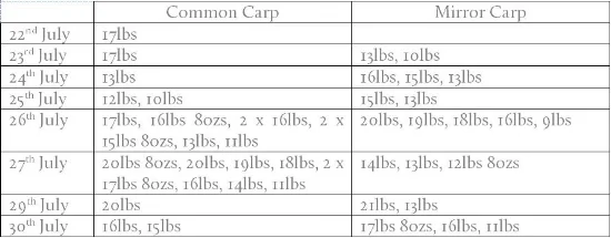 Arriving on the 10th July, regular Jason Tuckey experienced a very wet 24 hour session but still landed 7 x Mirrors and 3 x Carp weighing from 8lbs to 16lbs 8ozs. Returning on the 24th July Jason again experienced a wet 24 hour session but landed 9 x Commons to 18lbs 8ozs and 4 x Mirrors to 16lbs 8ozs where pacific tuna boilie was the successful bait.